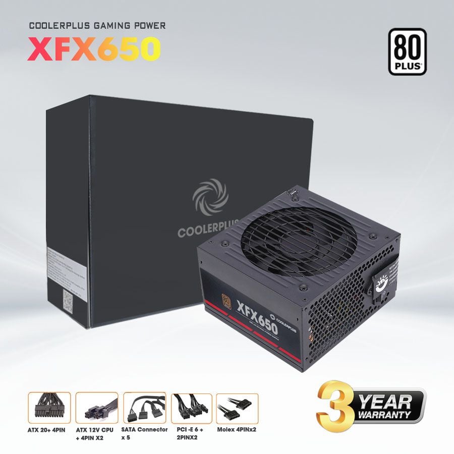 Mã sp: XFX650. Màu sắc: Đen. Bảo hành cả cháy nổ. Công suất định danh: 650W. Nguồn đầu vào: 200 - 240V AC 5A 50-60Hz. Loại quạt : 140MM fan both silent and efficient. Tính năng bảo vệ: + OVP (Over Voltage Protection) – Bảo vệ quá áp: SCP (Short Circuit Protection) – Bảo vệ chạm tải: UVP (Under Voltage Protection) Bảo vệ thấp áp. Chứng nhận quy chuẩn SX: CE, Rohs, 80Plus, Active PFC.
