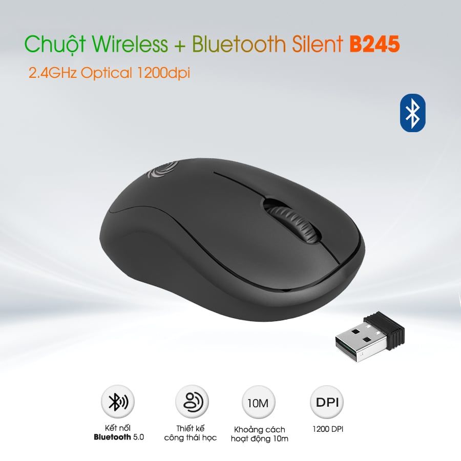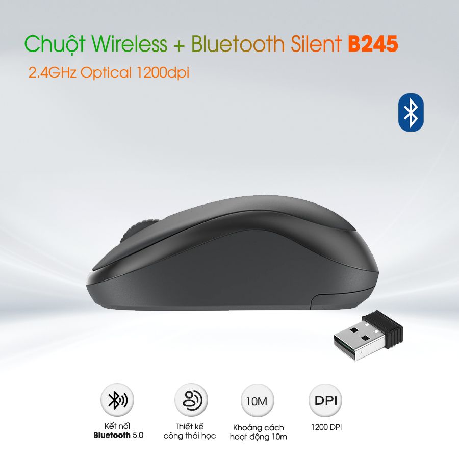 Với tính năng đa kết nối và thiết kế nhỏ gọn, B245 Wireless Mouse là một sản phẩm tuyệt vời cho những người dùng đa thiết bị và thường xuyên di chuyển.