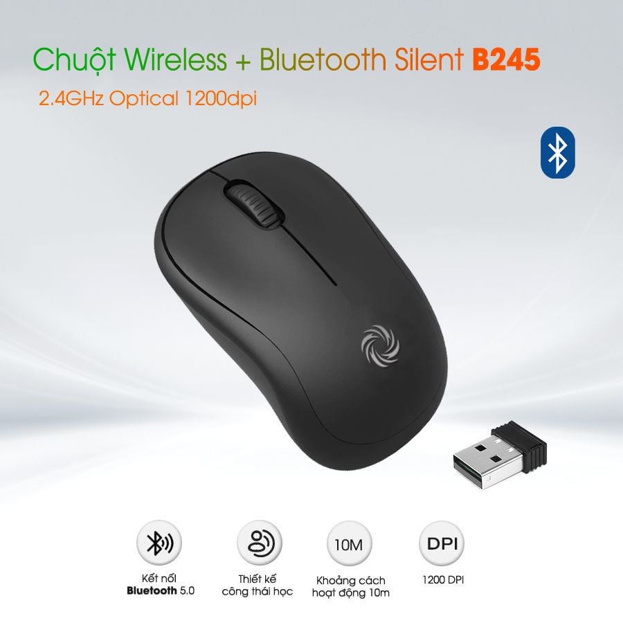 Mã sp: B245. Kết nối: Bluetooth 5.0 và Wireless 2.4G. Khoản cách kết nối: 10M. PIN: Sử dụng 1 Pin AA. DPI: 1200. Giảm 99% tiếng ồn. Hoạt động trên nhiều bề mặt. Thiết kế công thái học thoải mái khi sử dụng. Chế độ tự động ngủ giảm hao Pin. Bảo hành: 12 tháng