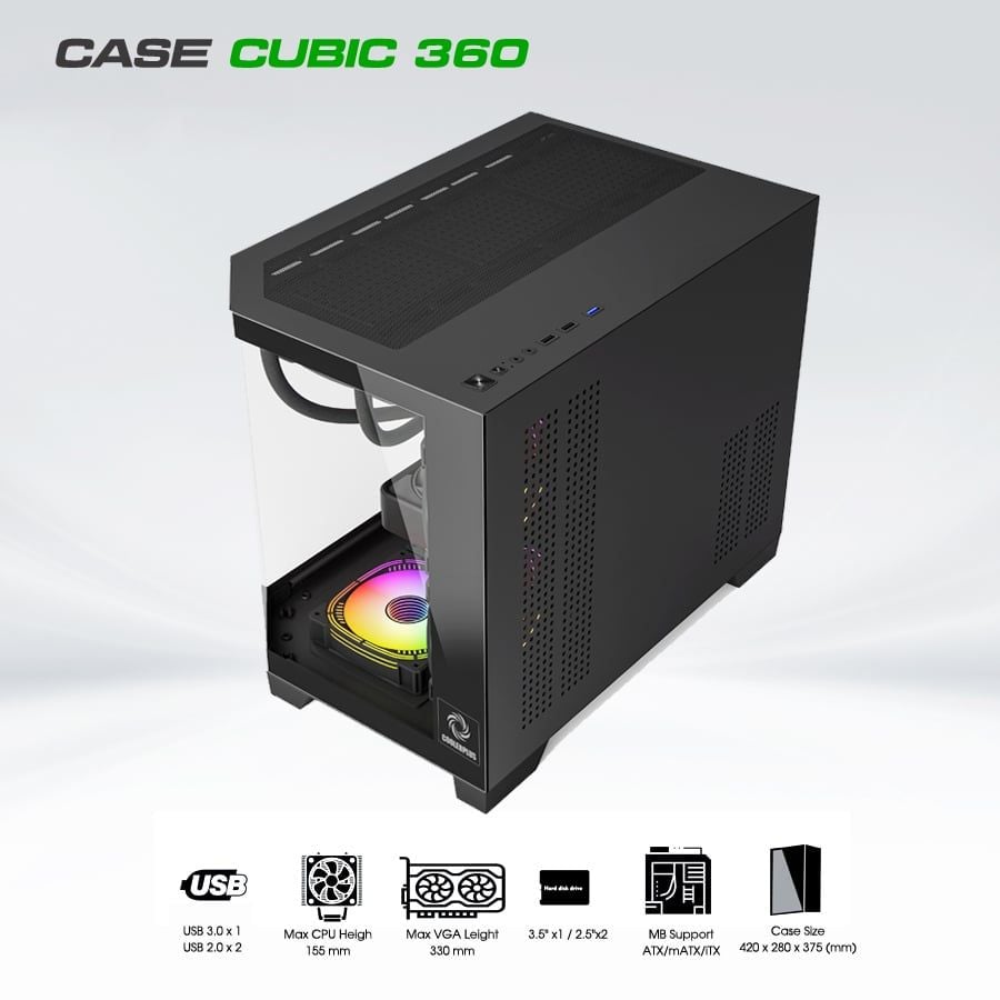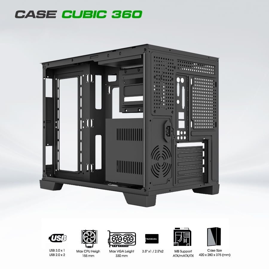 Mã sp: CUBIC-360. Màu sắc: Đen. Kích thước vỏ case: 420 x 280x 375 (mm). Hỗ trợ Main: ATX, mATX, Mini ITX. Số quạt gắn thêm tối đa: 9 (120mm). Chiều cao tản nhiệt CPU tối đa: 155mm. Chiều dài VGA tối đa: 330mm. Case không bao gồm quạt