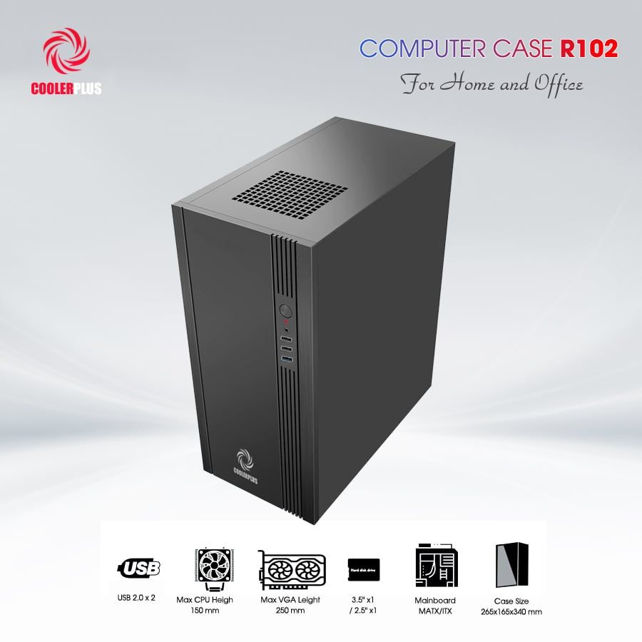 Mã sp: R102. Màu sắc: Đen. Kiểu dáng: M-Tower. Kích thước vỏ case: 293(L)*160(W)*352(H)mm. Chất liệu: 0.35mm SPCC. Kích thước tiêu chuẩn Case để lắp PSU: ATX. Khe cắm HDD & SDD: 3.5* HDD x1 + 2.5* SSD x1. Thiết bị kết nối ngoại vi I/O: USB2.0x2 + USB 3.0x1, HD Audio. Quạt tản nhiệt: Mặt sau 8cm và mặt phải 12cm (Tùy chọn). Chiều cao tản nhiệt CPU tối đa: 135mm. Chiều dài thẻ VGA tối đa: 260mm